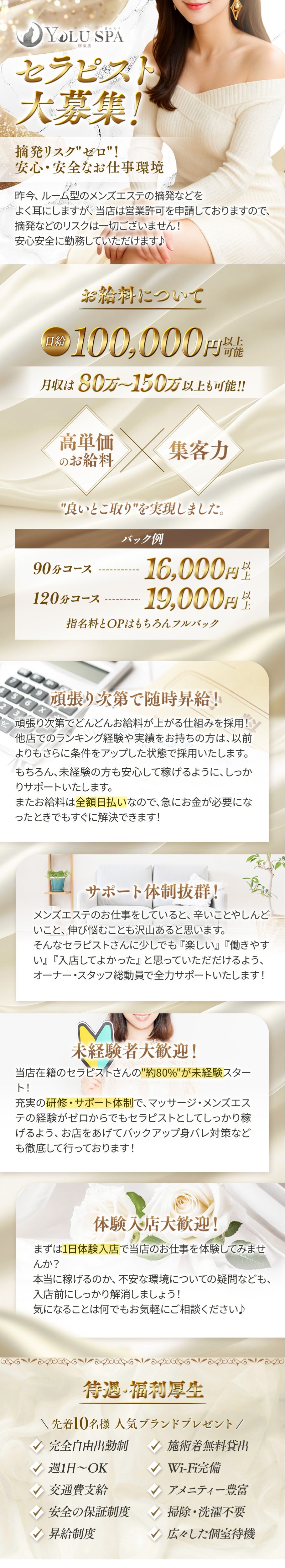 初心者からでも稼げるお店!1人接客すれば16,000円稼げます!!【安心安全に稼ぐ】がモットーなYOLU SPAで働いてみませんか?