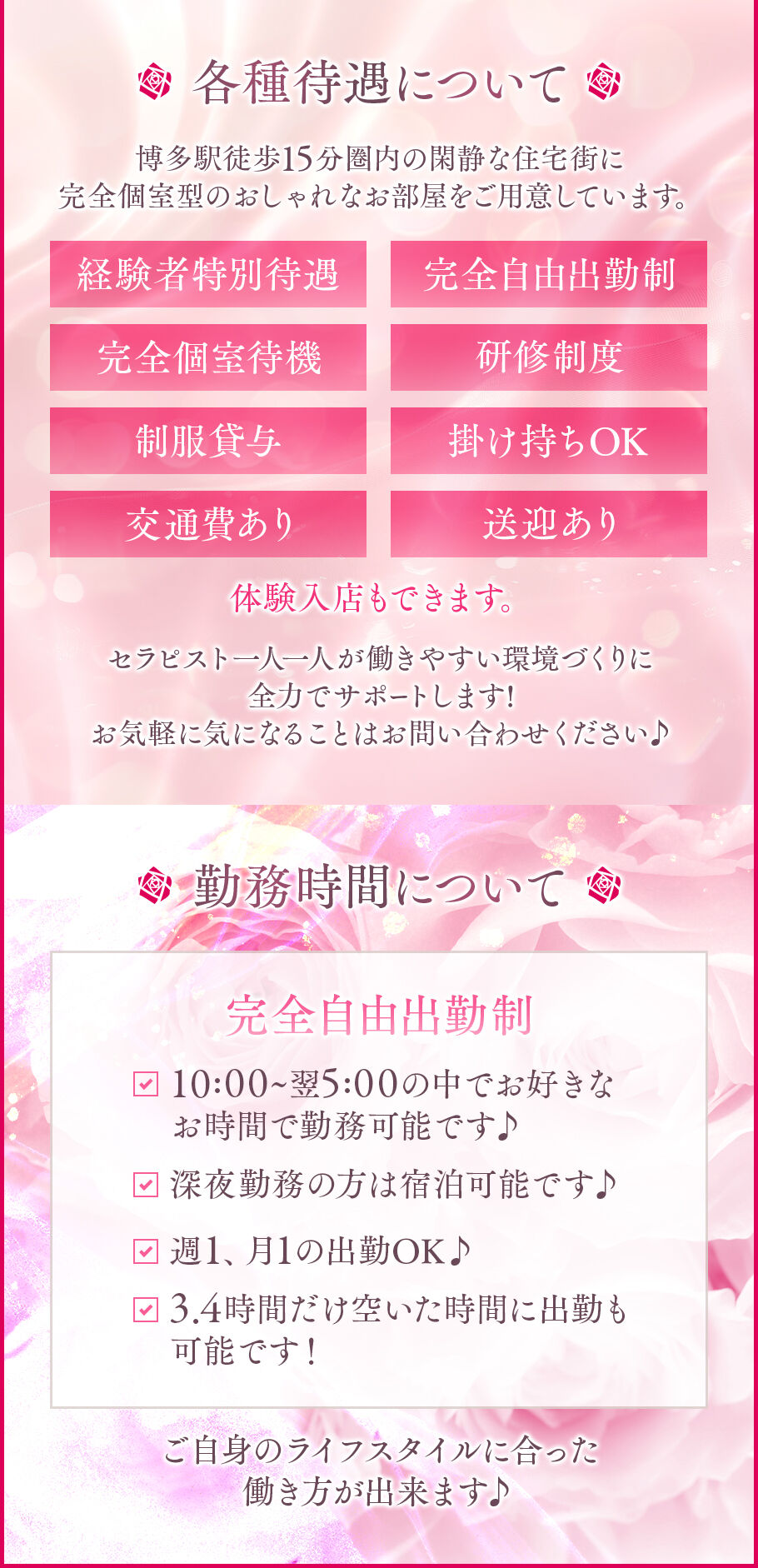 | 給与 | 施術料金の90%がお給料になります!(経験者のみ) 博多最大級のバック率でお待ちしております! |