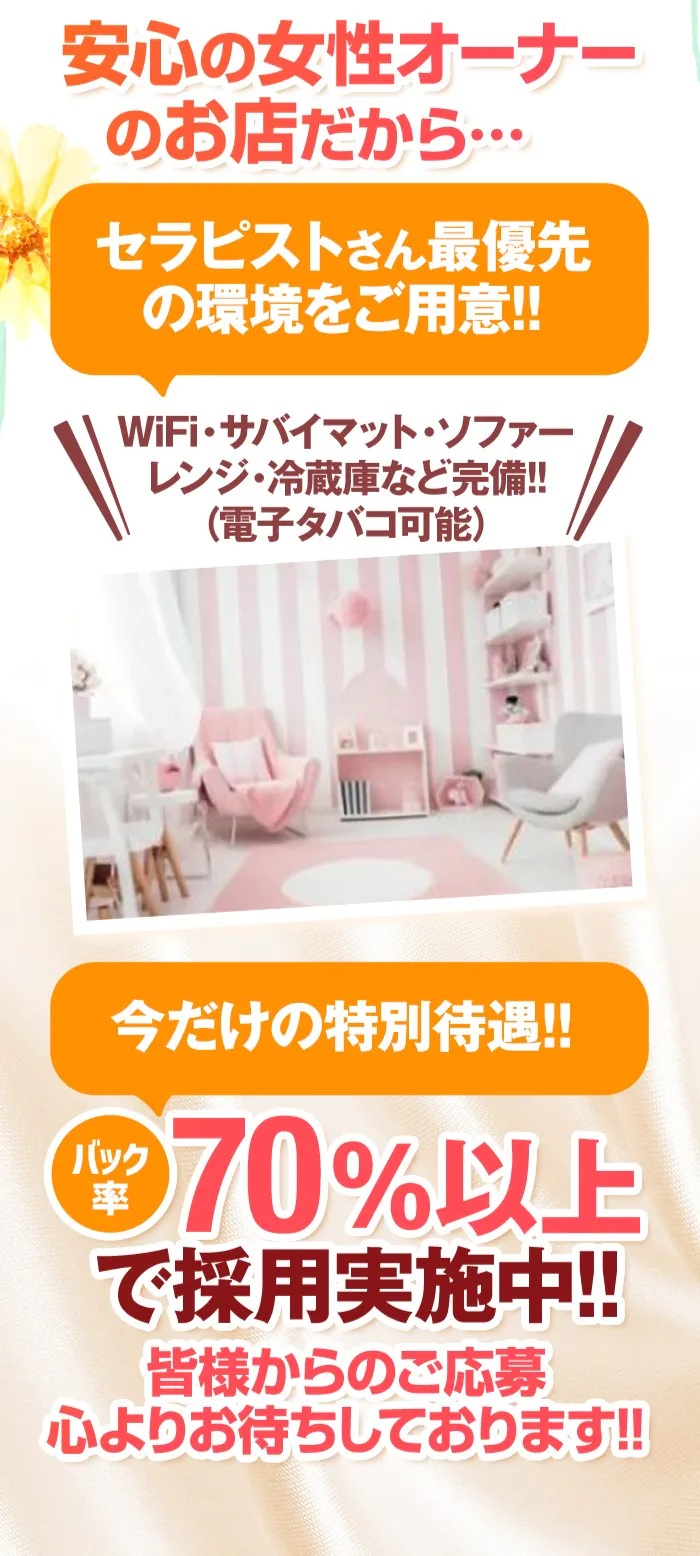 ・お友達紹介制度 ・未経験には専属女性講師での講習も希望によりできます!【経験者は講習なし可能】 ・店泊可能 ・wifi完備 ・掛け持ちOK ・施術しやすいサバイDX導入 ・女性店長が運営 |